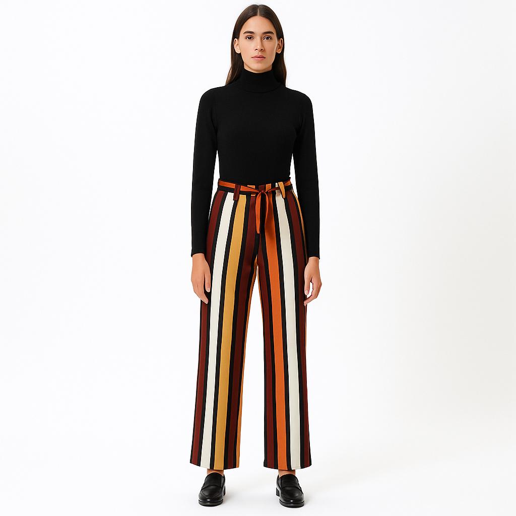 Pantalone a vita alta con fantasia a righe verticali nei toni caldi dell’arancio, senape, marrone e nero. La gamba ampia e morbida slancia la figura, mentre la cintura in tessuto coordinato valorizza il punto vita. Perfetto da abbinare a un maglione nero a collo alto o a una camicia basic per un look elegante ma al tempo stesso versatile.
