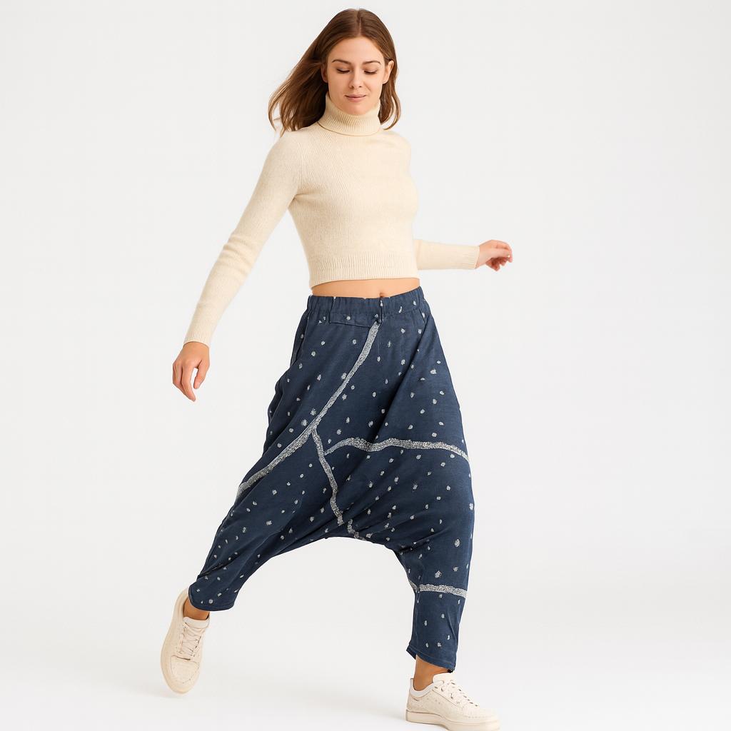 - Realizzato in un morbido tessuto effetto ginsato, questo pantalone offre un look moderno e originale, perfetto per chi ama distinguersi. La lavorazione con piccoli motivi a contrasto dona un carattere artigianale e ricercato, mentre la vestibilità morbida e il cavallo leggermente basso garantiscono comfort e libertà di movimento.