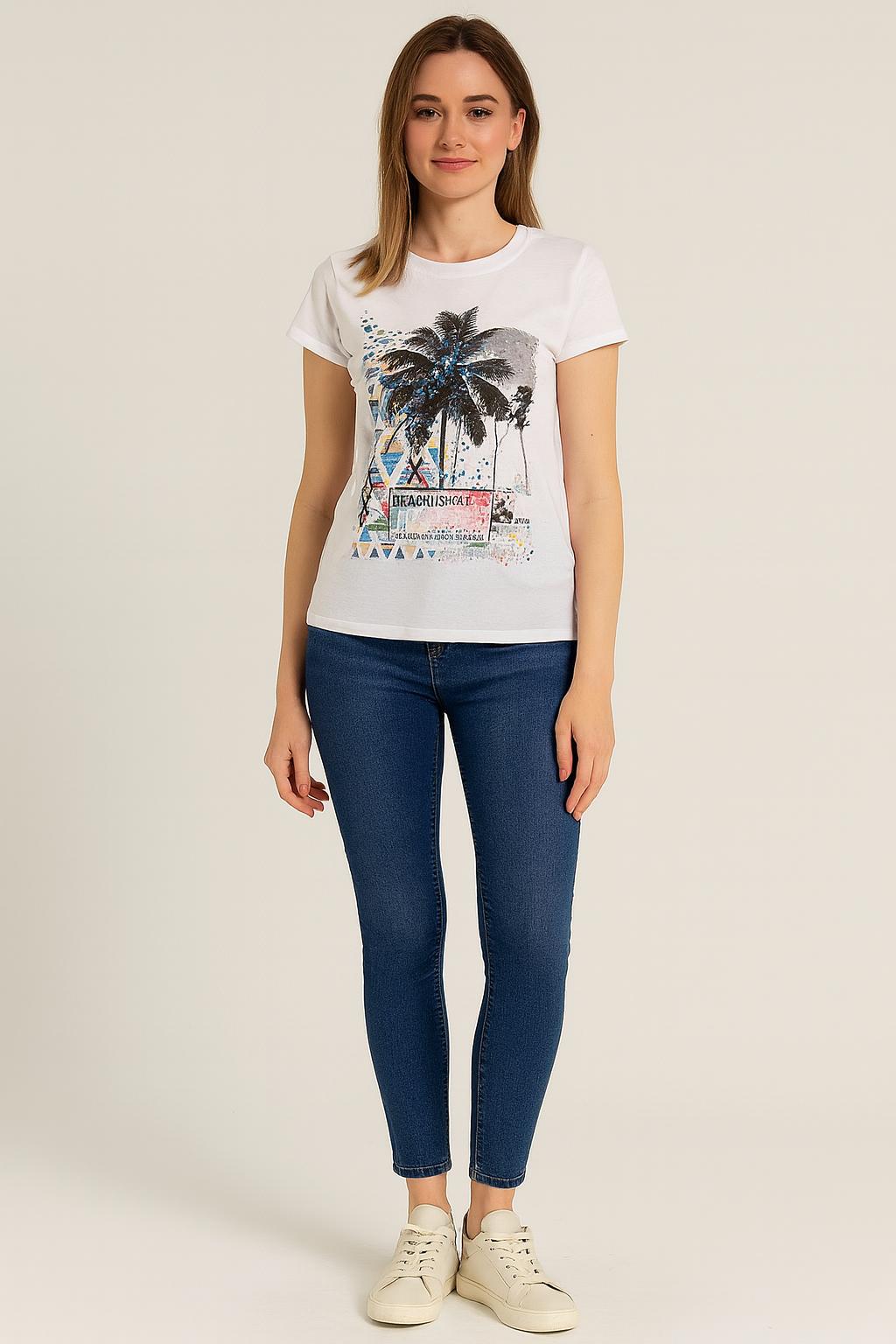Questa t-shirt in puro cotone è fresca, leggera e perfetta da indossare ogni giorno. La stampa con palme e dettagli colorati richiama subito lo stile estivo e spensierato, aggiungendo un tocco vivace e trendy al tuo look.