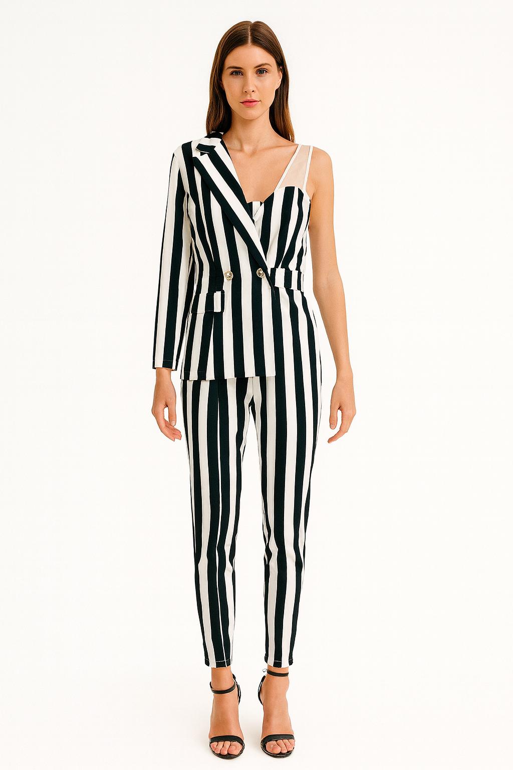 • Tuta rigata bianco e nero, elegante e originale, con righe verticali che slanciano e dettagli asimmetrici che ti distinguono.