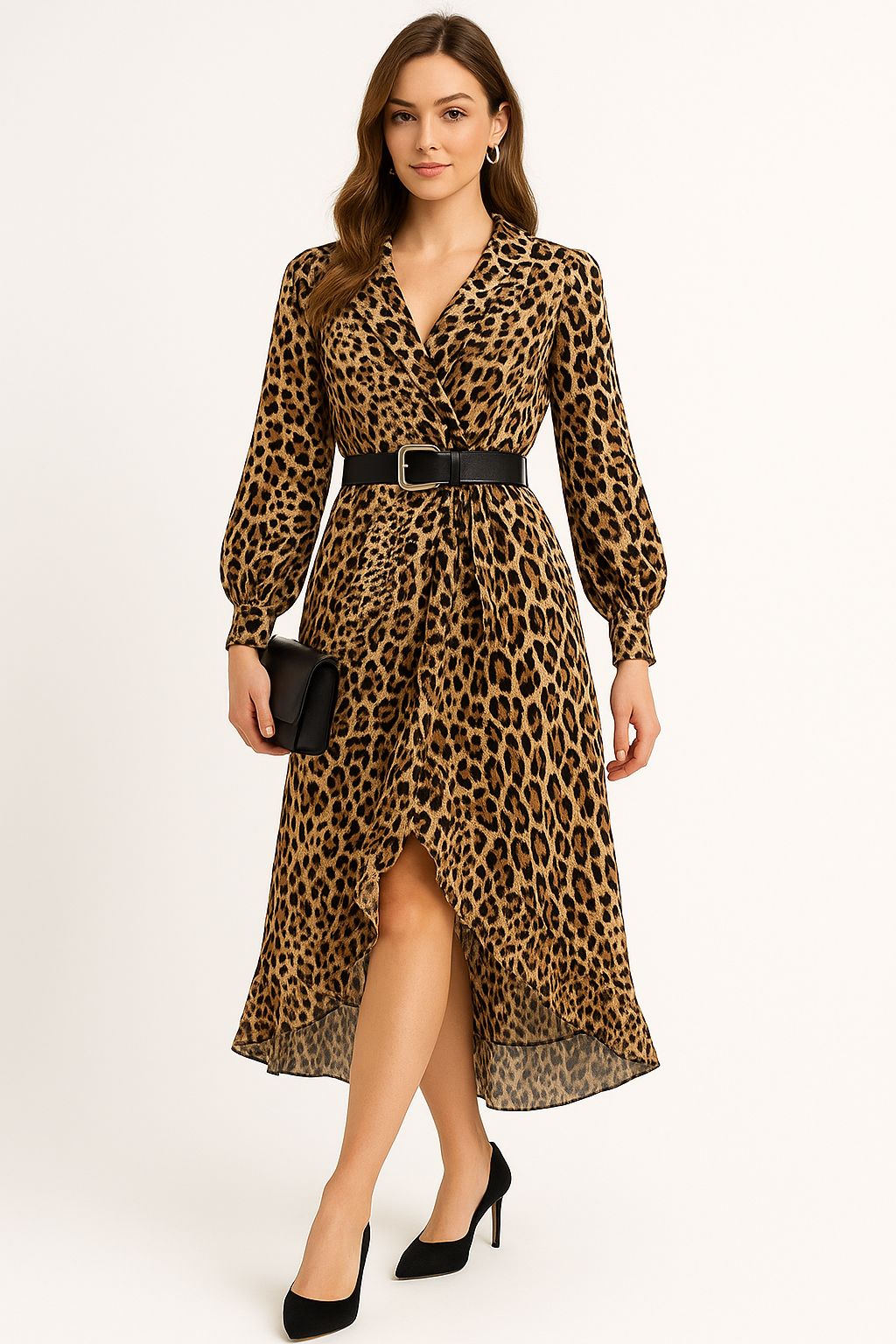 Questo vestito in stampa leopardata è pensato per chi ama osare con eleganza. Il taglio a portafoglio con cintura in vita valorizza la silhouette, le maniche lunghe ampie aggiungono fluidità e il fondo asimmetrico dona movimento e leggerezza. Un capo che unisce grinta e femminilità, perfetto per distinguersi con classe. -