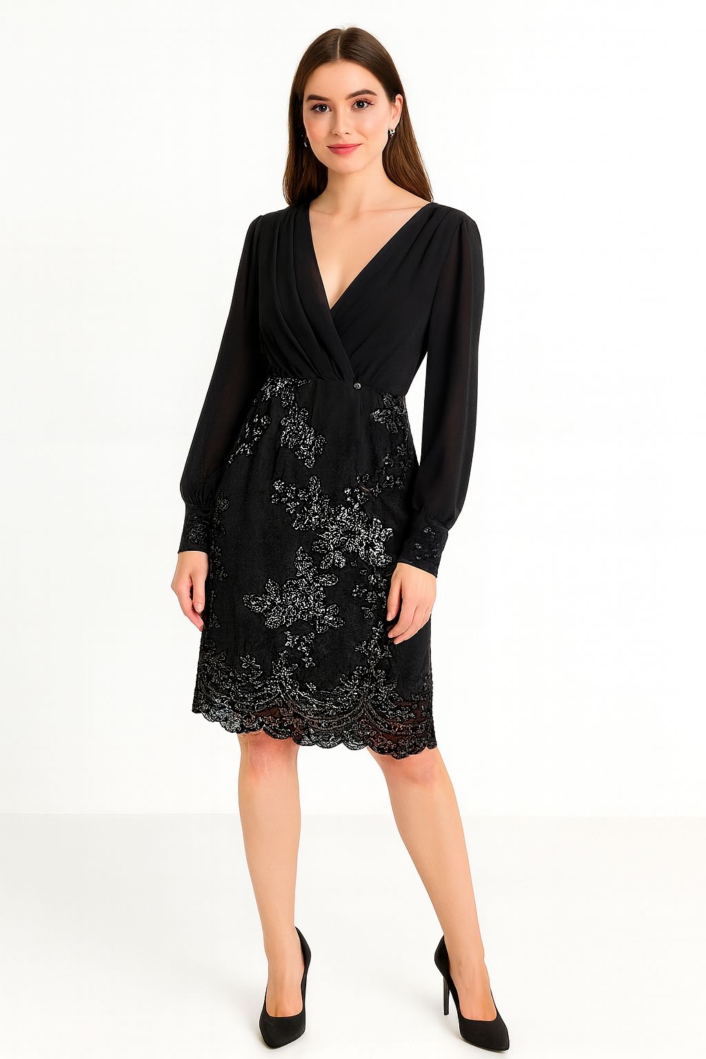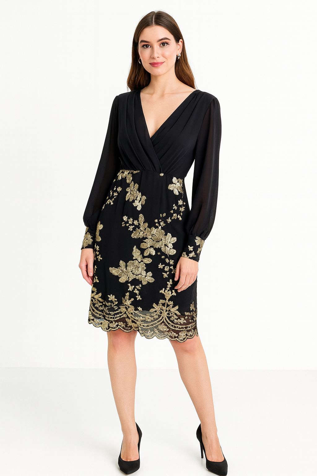 Un abito elegante e raffinato, nero con ricami dorati che illuminano la figura e regalano un tocco prezioso. Il taglio incrociato sul davanti valorizza il décolleté, mentre le maniche lunghe leggermente trasparenti aggiungono femminilità e classe.