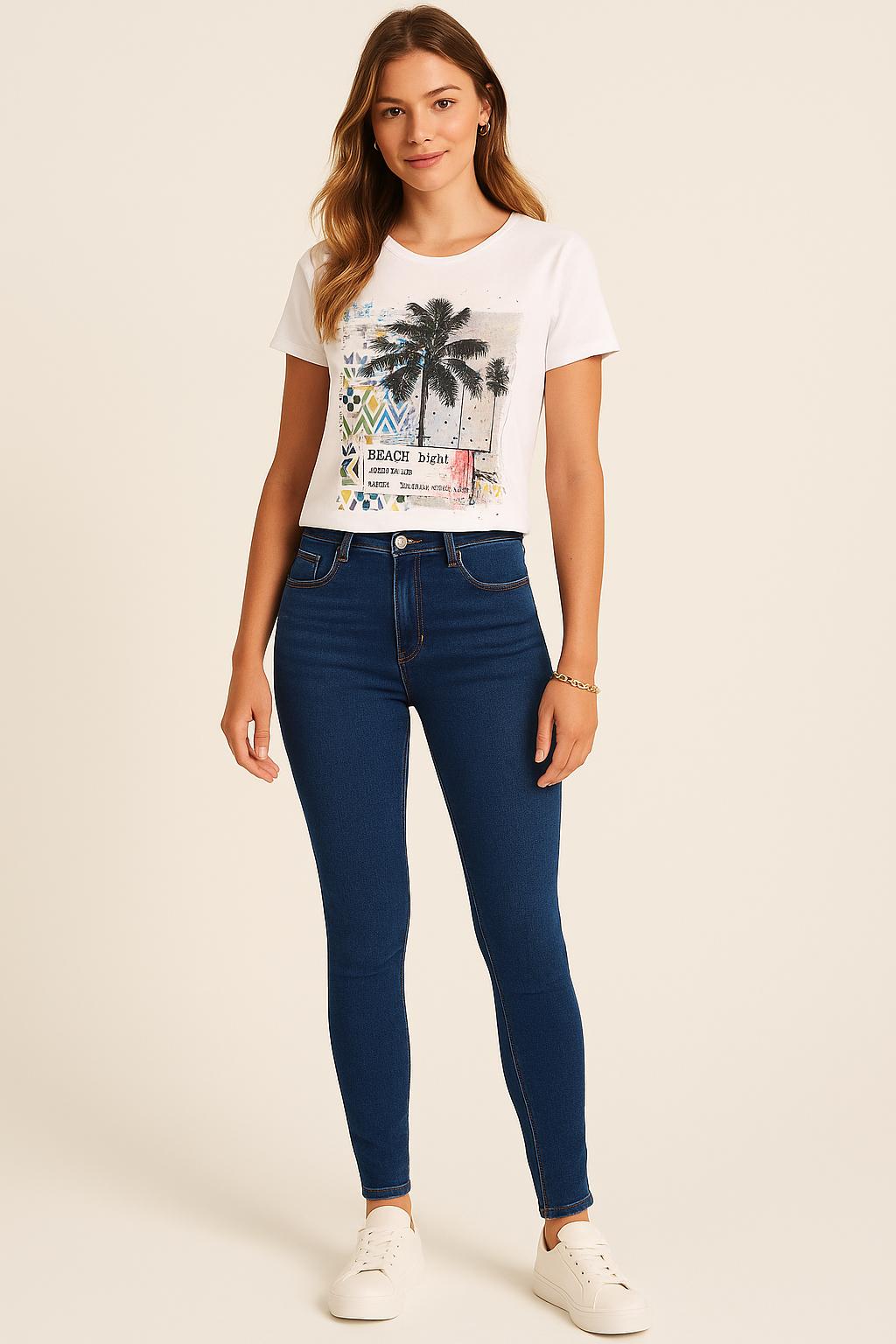 • T-shirt in cotone: fresca e morbida sulla pelle, arricchita da una bellissima stampa con palme e dettagli geometrici, resa ancora più luminosa dai brillantini applicati.