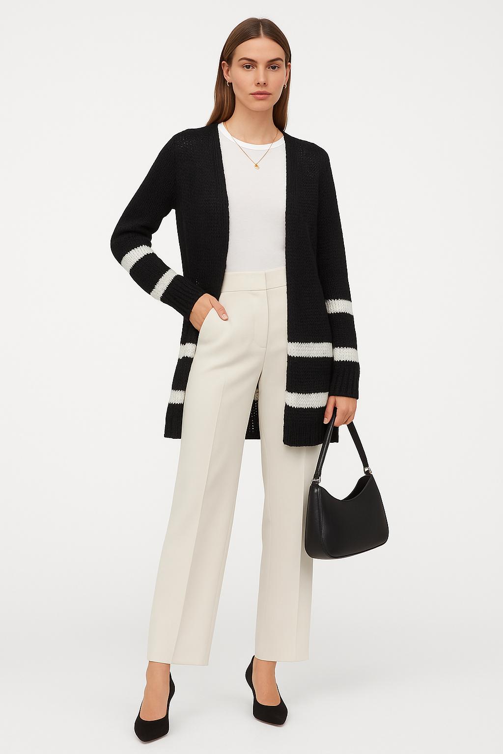 Realizzato in maglia leggera, questo cardigan nero si distingue per le iconiche fasce bianche sulle maniche e sul fondo, che donano movimento e un tocco moderno al look. La vestibilità comoda e la lunghezza media lo rendono ideale sia per il giorno che per la sera, facile da abbinare a jeans, pantaloni eleganti o abiti. -