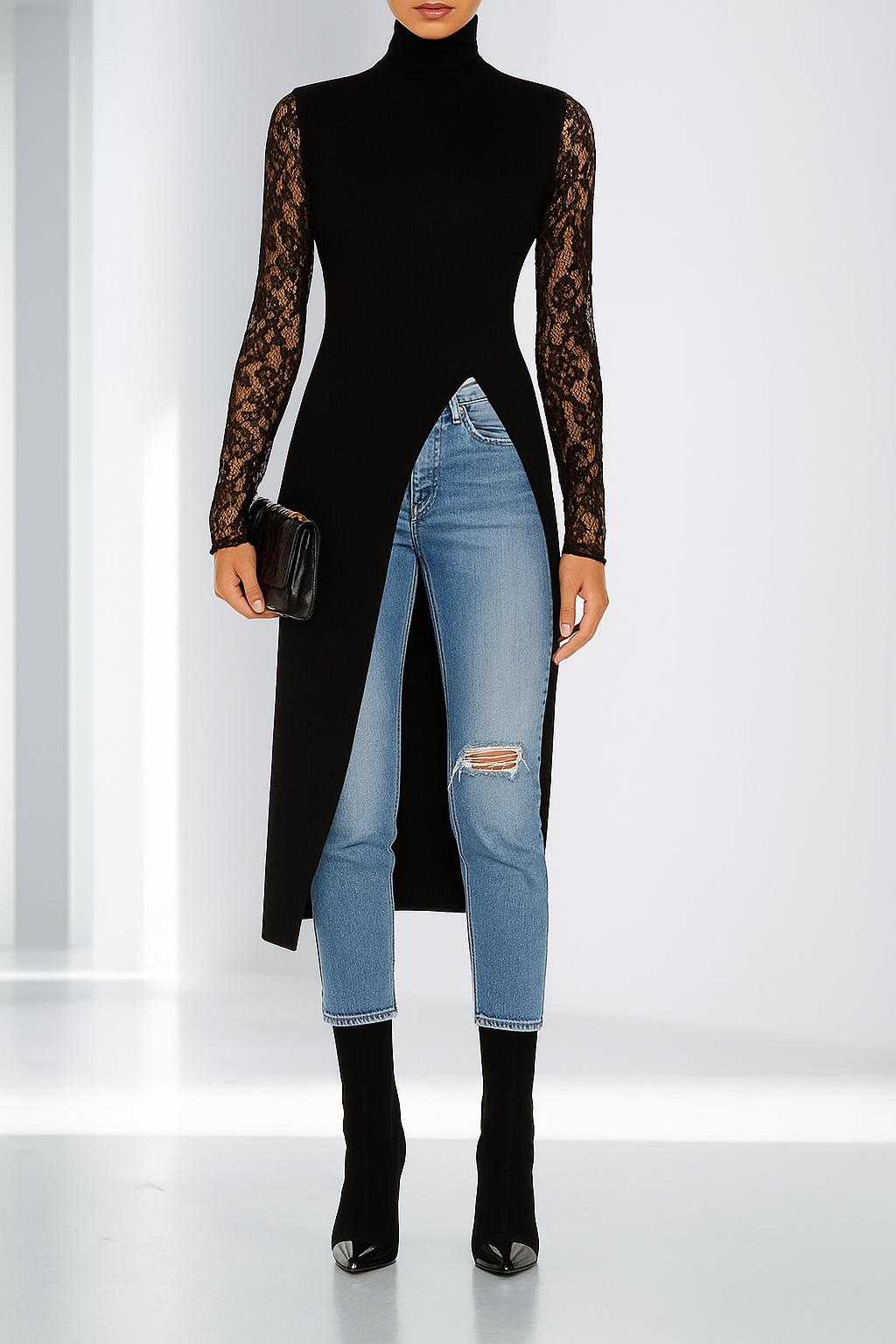 - Una maglia unica e di carattere: il mezzo collo alto le dona un’eleganza pulita, mentre le maniche in pizzo trasparente aggiungono un tocco sensuale e raffinato. Lo spacco trasversale profondo sul davanti rende il capo dinamico e versatile, capace di trasformare un outfit casual in qualcosa di sorprendentemente chic.
