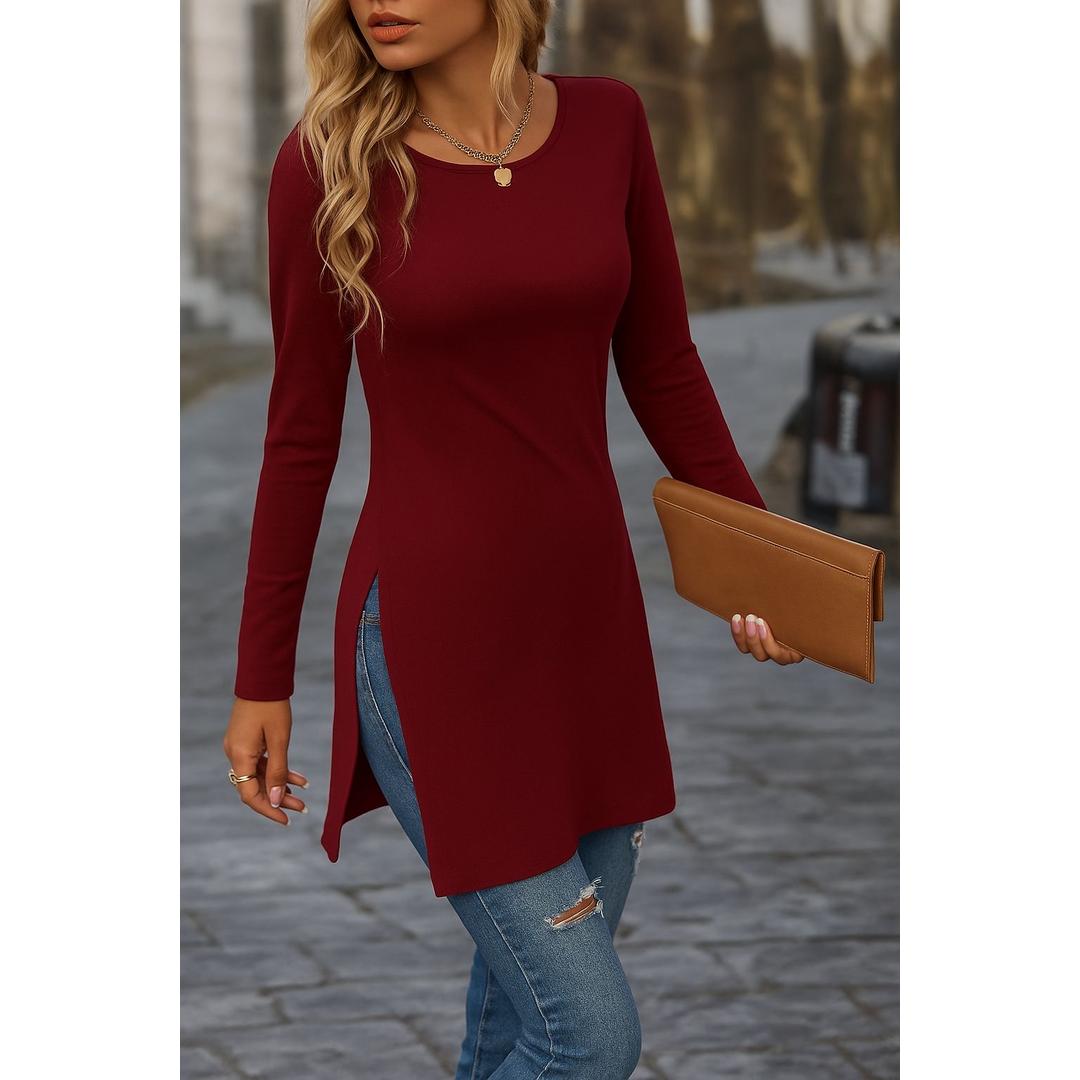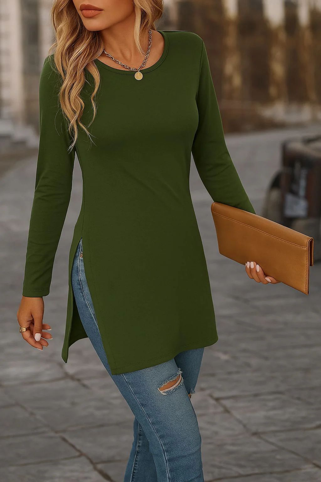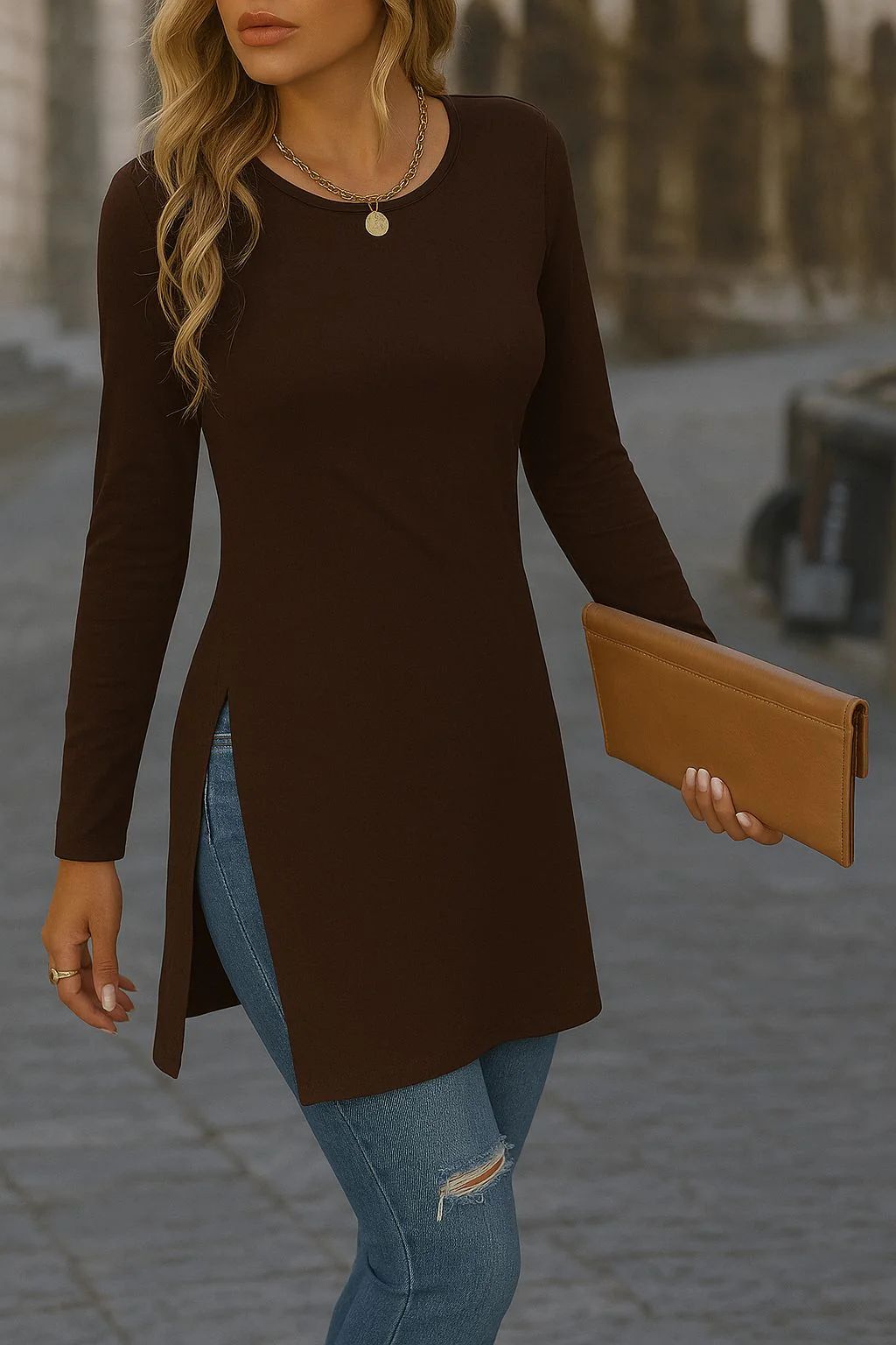 Un capo versatile e moderno che unisce comfort e stile. Questa maglia a maniche lunghe, con taglio dritto e spacchi laterali, slancia la figura e si adatta a qualsiasi occasione: dal look casual con jeans a quello più elegante con pantaloni e accessori. Il tessuto morbido ed elasticizzato garantisce libertà di movimento e una vestibilità comoda per ogni silhouette.