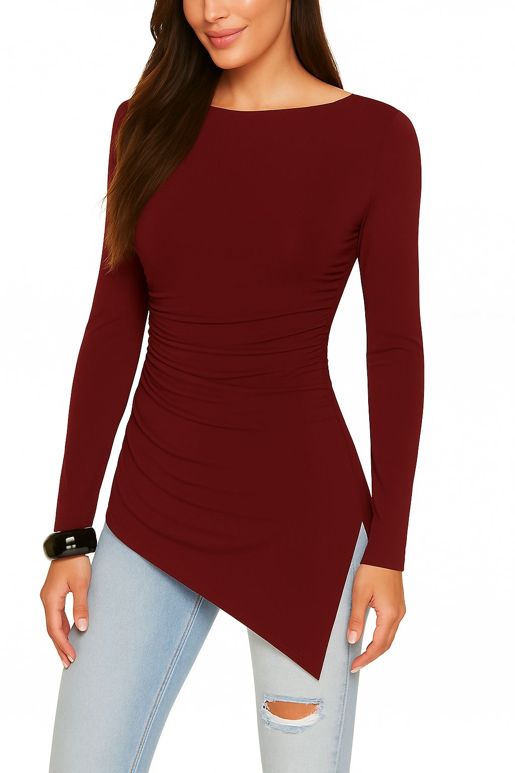 - Scopri la nuova blusa a maniche lunghe con taglio asimmetrico: un capo che unisce eleganza e comfort per ogni occasione. Il tessuto morbido e leggermente elasticizzato valorizza la silhouette, mentre il dettaglio drappeggiato sui fianchi dona un tocco raffinato e femminile.