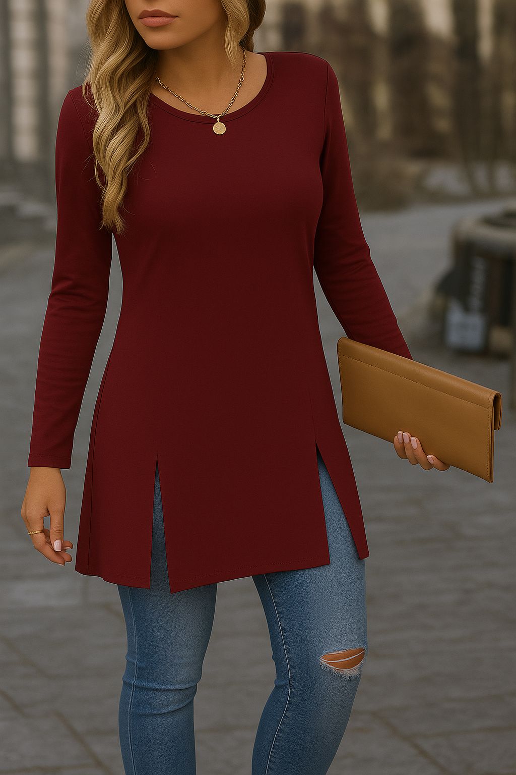 Dettagli: scollo rotondo, spacchi frontali, vestibilità comoda ed elegante