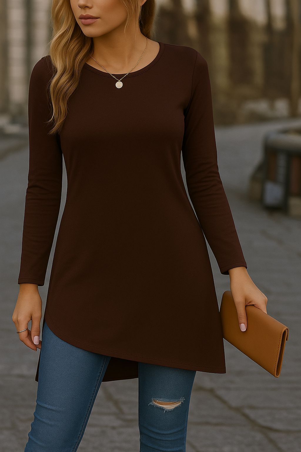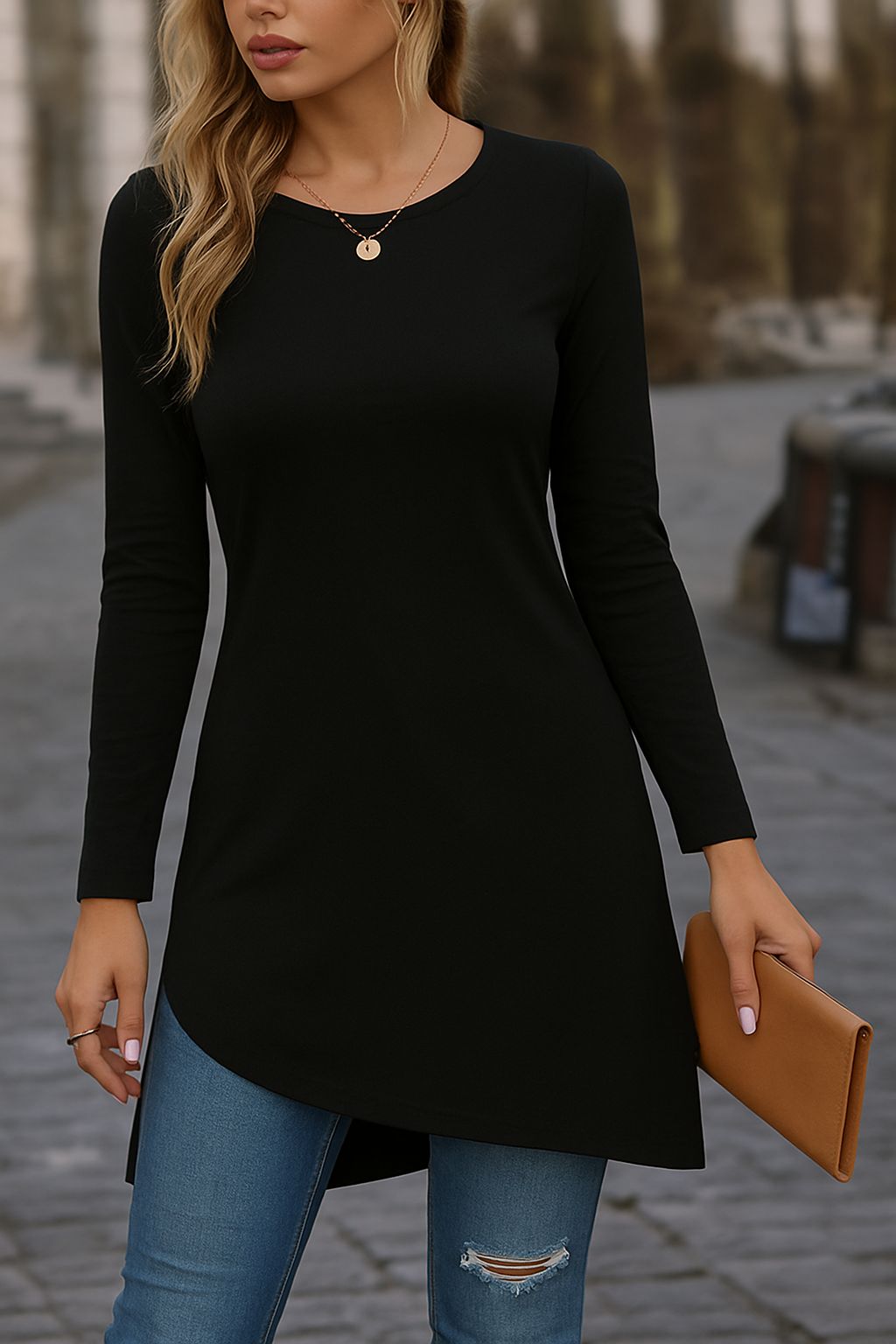 - Blusa a maniche lunghe con scollo rotondo e fondo asimmetrico, un capo essenziale ma elegante, pensato per unire semplicità e stile. Il tessuto morbido garantisce comfort durante tutta la giornata, mentre il design versatile la rende adatta sia a look casual con jeans che ad abbinamenti più ricercati per occasioni eleganti.