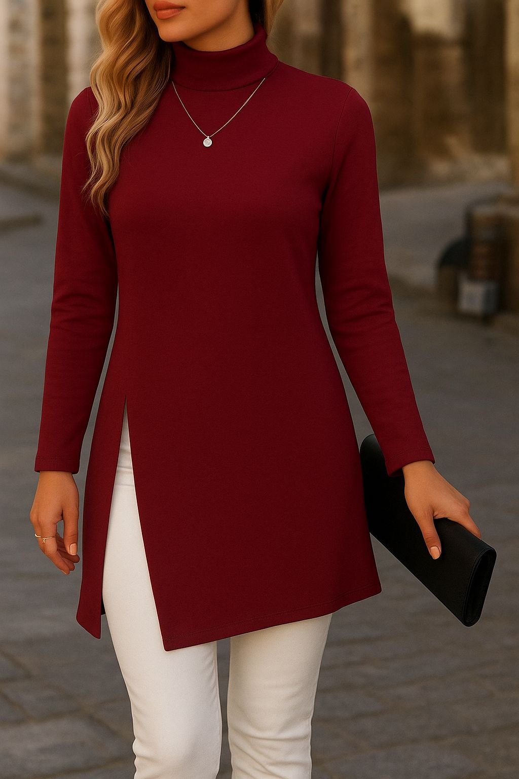 Il design con collo a lupetto dona un tocco sofisticato, mentre lo spacco laterale aggiunge modernità e slancio alla figura. -