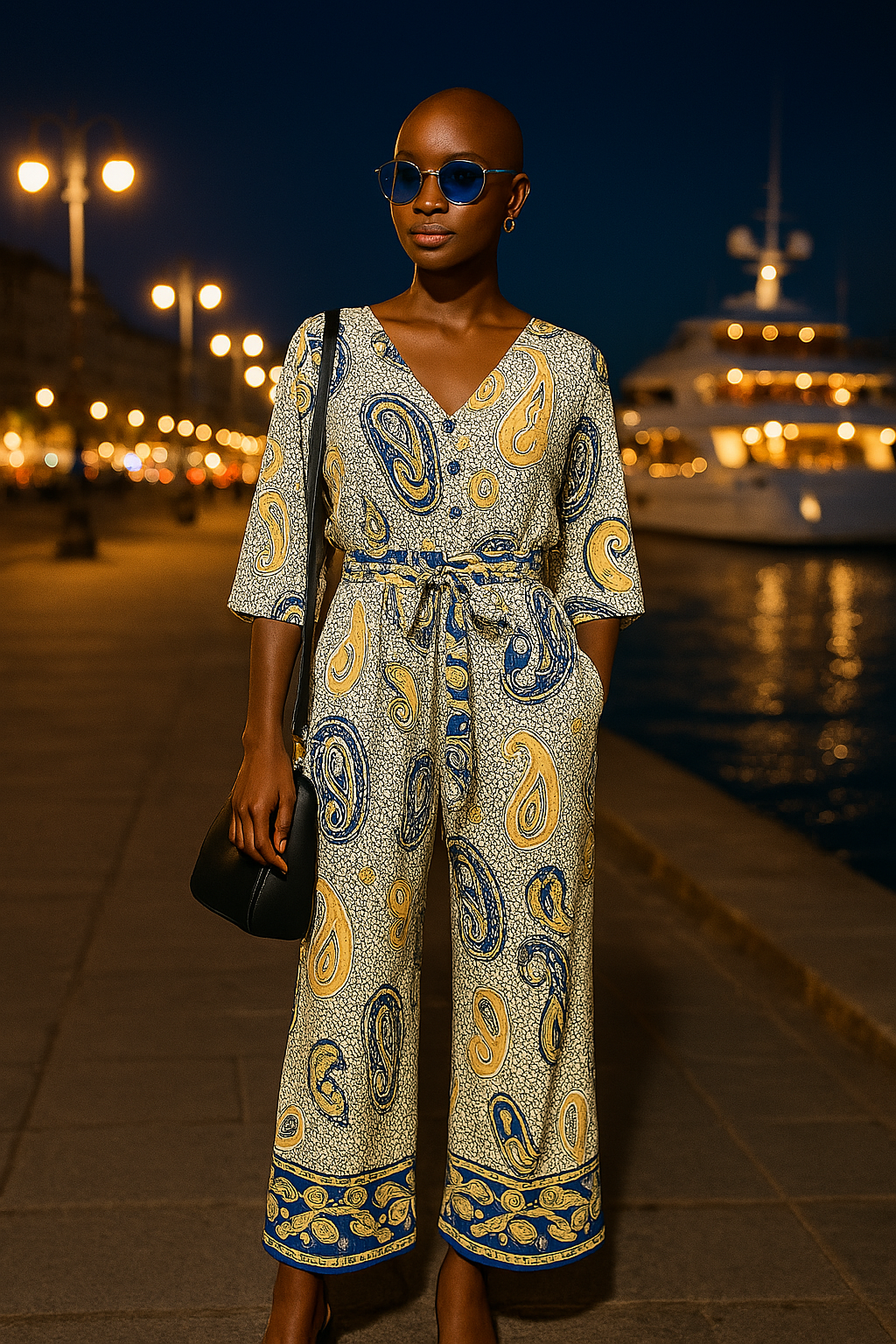 Questa tuta intera a fantasia è il capo perfetto per affrontare la bella stagione con stile e leggerezza. Realizzata in un tessuto fresco e traspirante, è ideale per i mesi primaverili ed estivi, garantendo comfort e libertà di movimento in ogni momento della giornata.