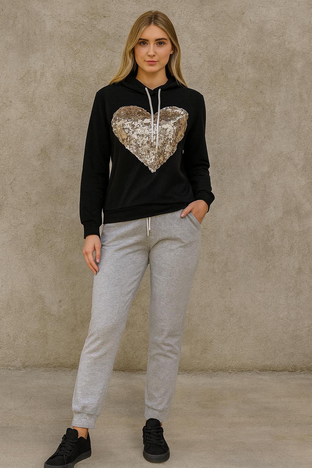 Questa tuta è il mix perfetto tra comodità e stile. La felpa nera è arricchita da un maxi cuore in paillettes double face: basta una carezza per cambiare colore ed effetto, un dettaglio unico che la rende originale e divertente. I pantaloni grigi in cotone, morbidi e pratici, completano l’outfit per un look casual ma sempre curato.