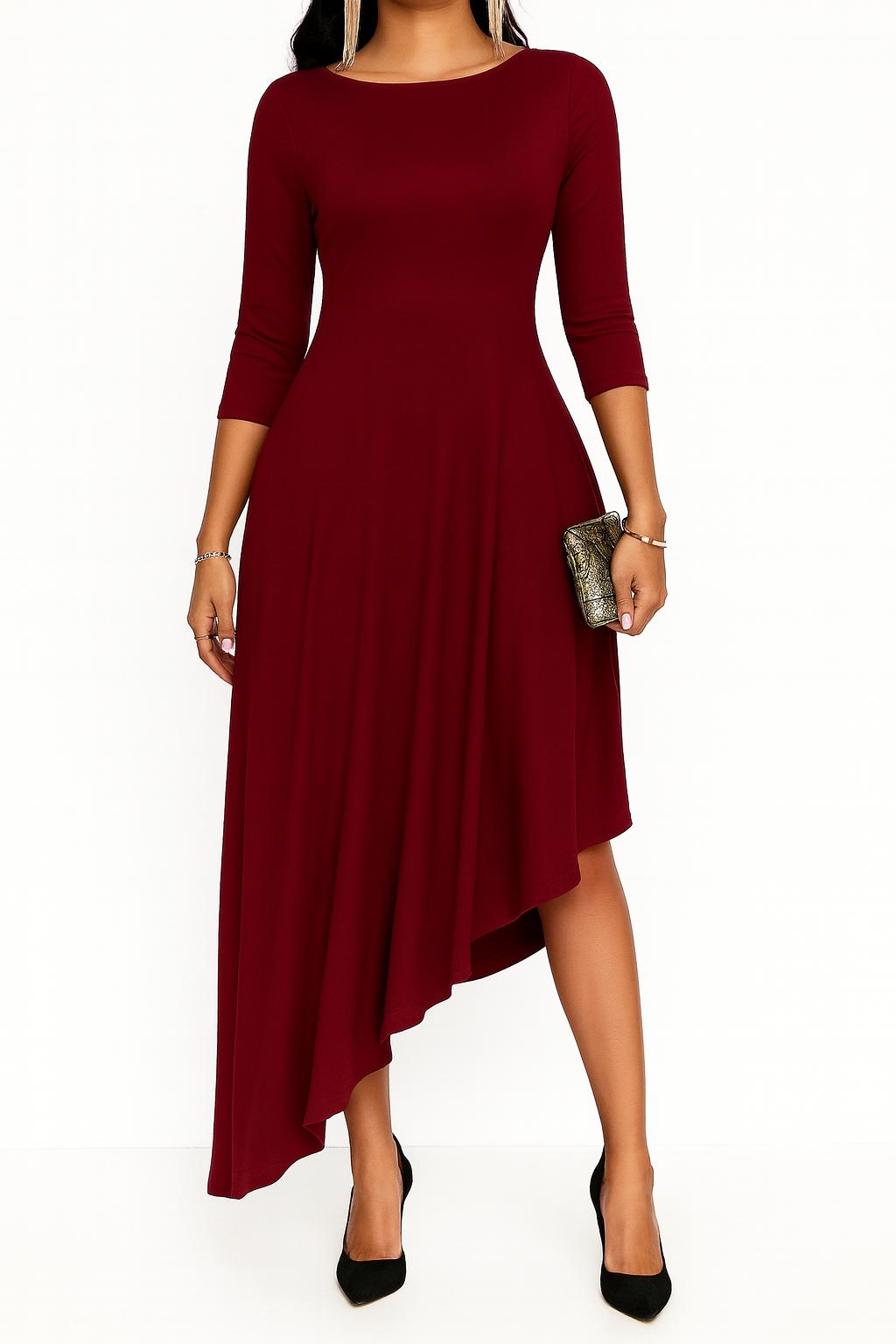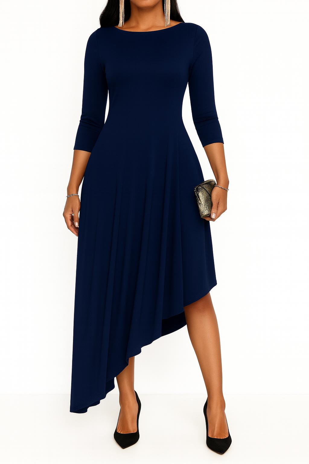 Abito nero elegante asimmetrico, caratterizzato da scollo rotondo, maniche a 3/4 e gonna svasata con taglio irregolare che dona movimento e femminilità. Realizzato in tessuto morbido e confortevole, è perfetto per cerimonie, eventi serali o occasioni speciali in cui vuoi sentirti raffinata e sicura di te. La linea slanciata valorizza ogni silhouette, unendo eleganza e comfort in un solo capo.