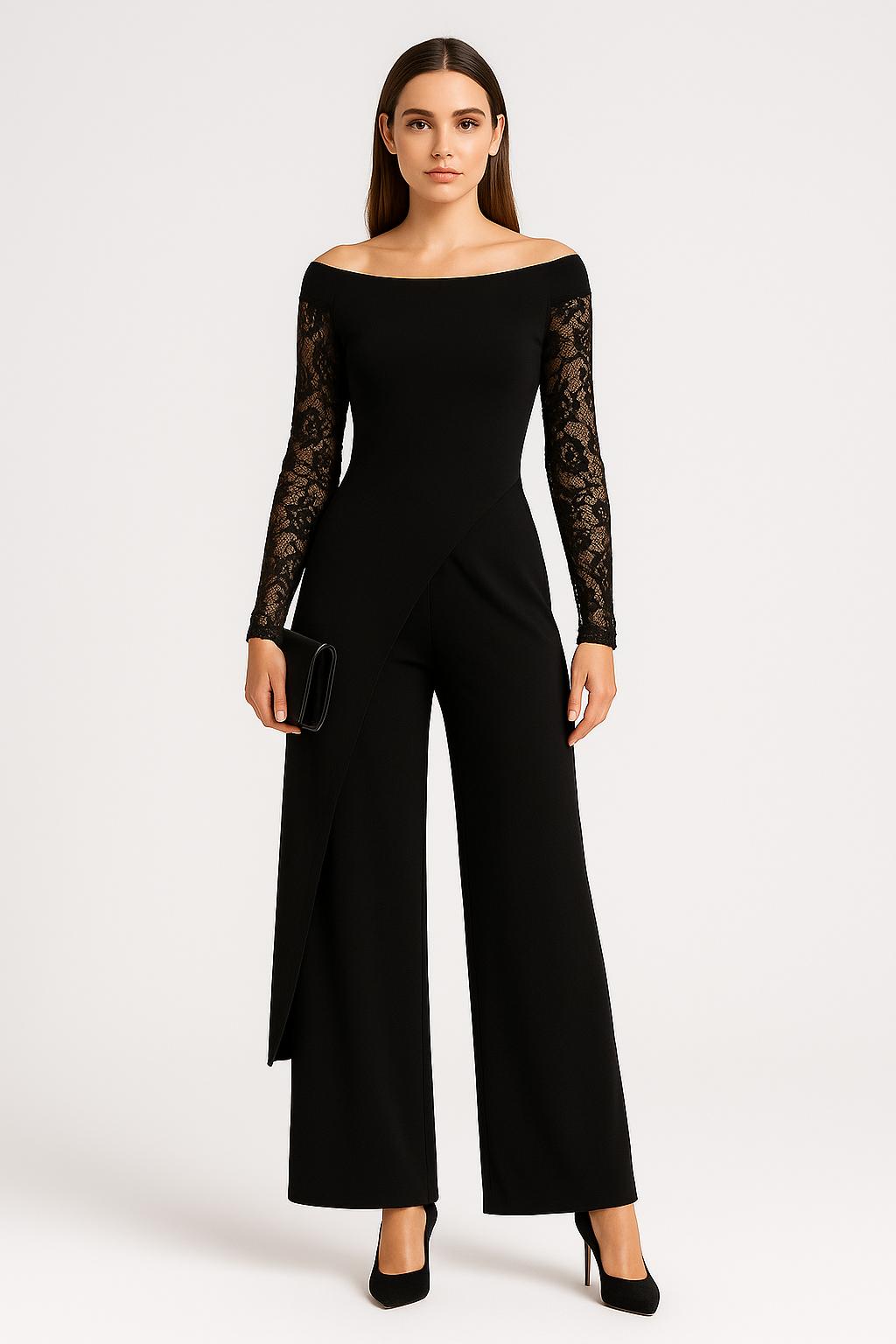 Questo completo rappresenta l’eleganza più moderna e sofisticata. La maglia, lunga e dal taglio asimmetrico, presenta uno spacco frontale profondo che dona movimento e slancio alla figura, valorizzando la silhouette senza mai risultare eccessivo. Lo scollo a barca mette in risalto le spalle con grazia e femminilità, mentre le maniche in pizzo floreale aggiungono un tocco di sensualità raffinata, trasformando questo capo in un vero gioiello di stile.