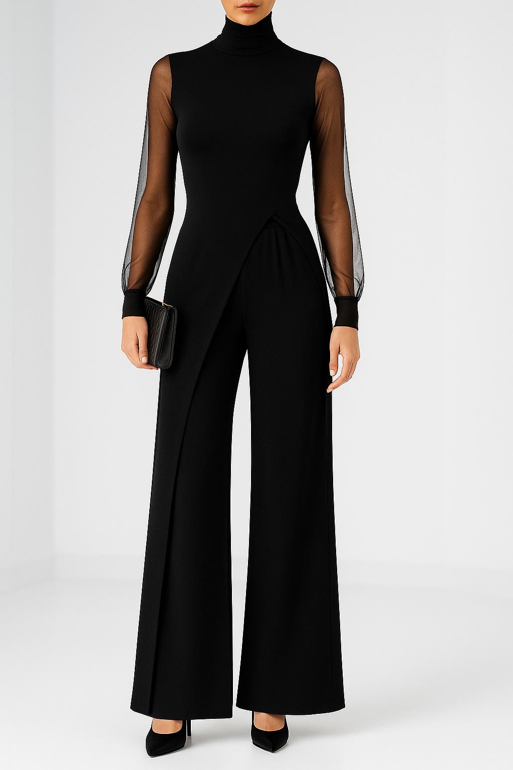 Un capo dal design sofisticato e contemporaneo: la maglia presenta un profondo spacco asimmetrico sul davanti, che dona movimento e un tocco di sensualità discreta. Le maniche in tulle trasparente aggiungono eleganza e leggerezza, creando un contrasto raffinato con la struttura del tessuto principale.