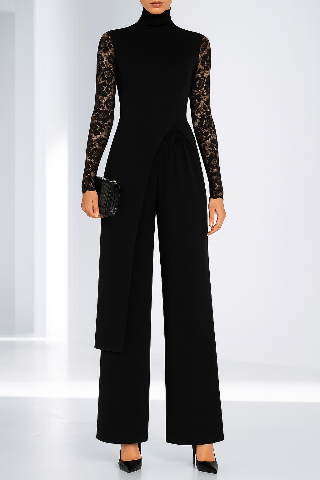 Un outfit dal fascino intramontabile: la maglia presenta un mezzo collo raffinato e un taglio trasversale asimmetrico sul davanti, che regala movimento e modernità alla linea. Le maniche in pizzo trasparente aggiungono sensualità ed eleganza, creando un contrasto perfetto con la struttura compatta del tessuto principale.